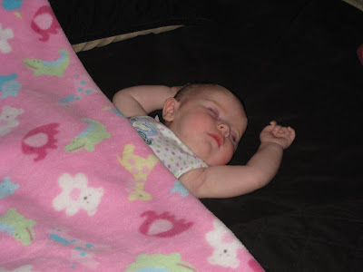 I had her from about 1:30 until 7:30. Karla said between 2 and 2:30 she would be hungry and she was. After that, she slept from about 2:30 until 6, as depicted below (between 2 of the 11 pillows on my bed!!!) I was starting to wonder...do I wake her up to feed her??? It's been 4 hrs...isn't there a cardinal rule of "never wake a sleeping baby?" I moved her from the bed into the car seat, thinking that would wake her up - nope. About 30 min later, I saw her eyes open and seized the opportunity - she sucked down 4 oz in about 10 minutes! After she was done eating, we had a diaper change and were looking at each other on the couch when the doorbell ran...mom and dad were back!!! My mom said - Don't be fooled, they are not always like this. Yeah, no doubt. I told John and Karla she was perfect little angel...followed by "HAVE FUN TONIGHT!!!